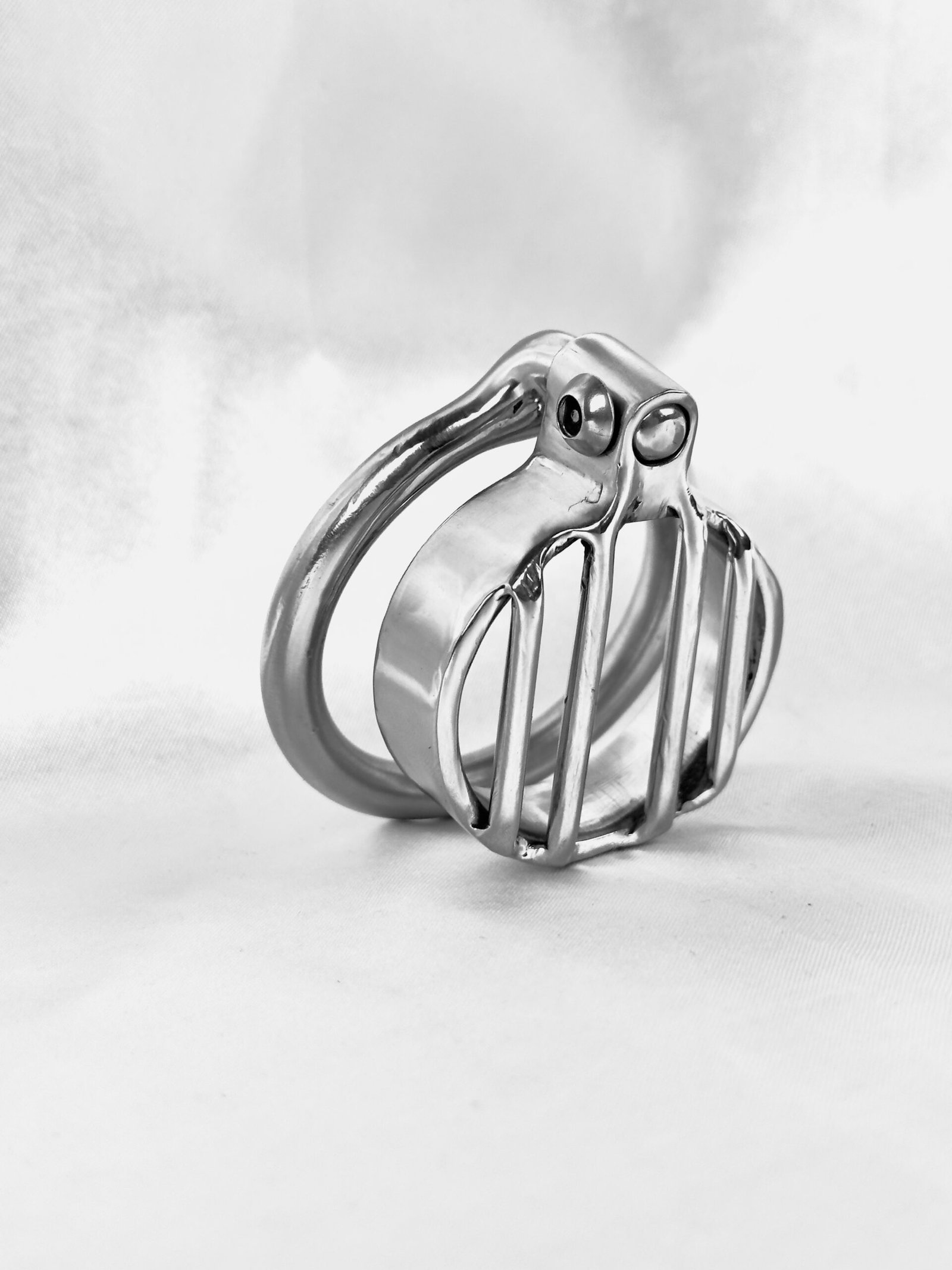 This is one of our newest models. It features the flat ring of a watchful Mistress but with a flat front. This makes it one of the most miniature cages on the market. It has one of the most open fronts of any micro device and it can still be made in any cage or ring diameter for a truly custom fit.
